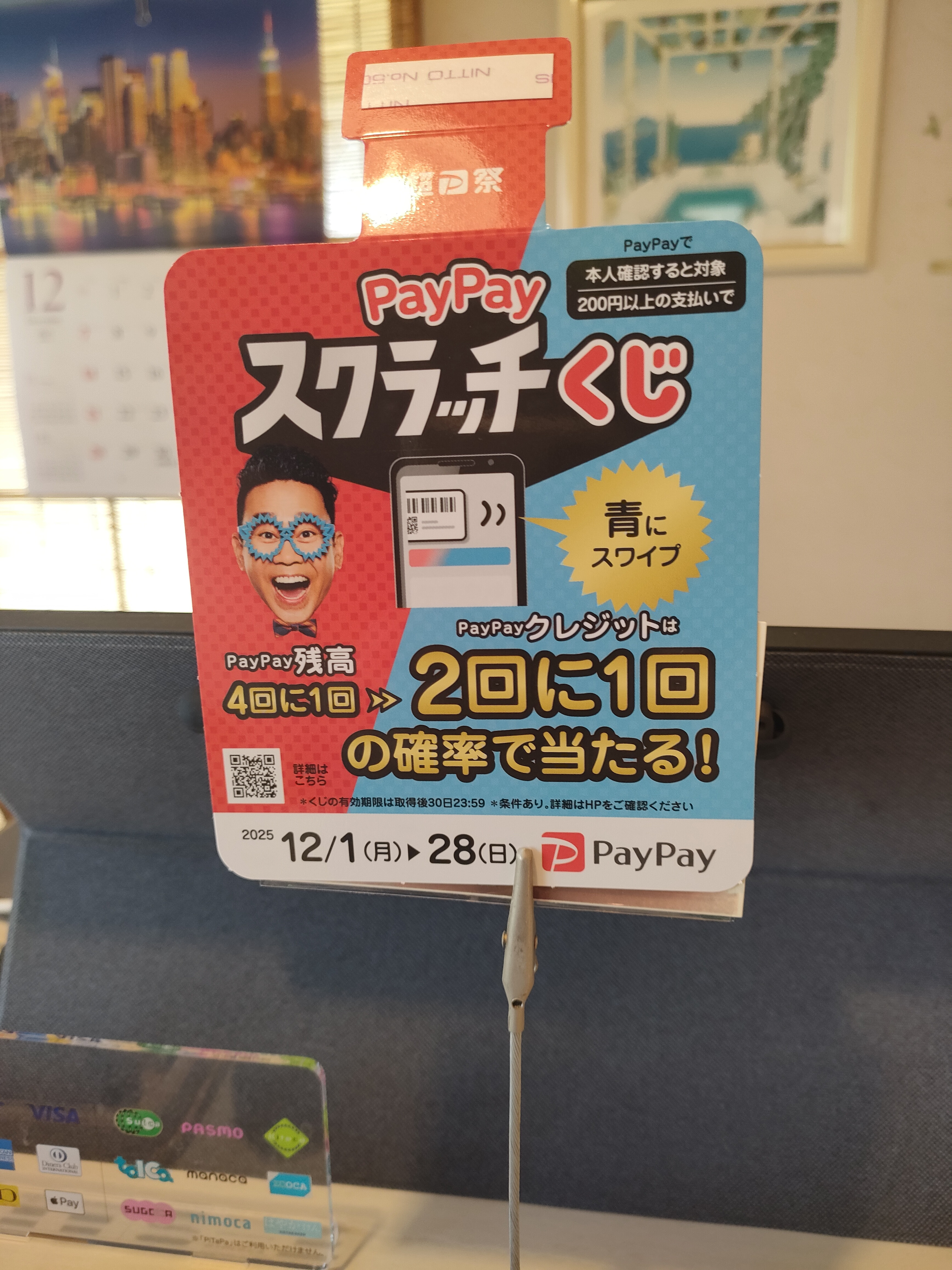 2025 . 12 . 04 12月はPayPayスクラッチと入浴剤をプレゼント 12月1日から28日までPayPayでお支払い頂くとスクラッチチャンス! 今年も暮れの感謝を込めて来店された方に入浴剤をプレゼント! 粗品ですが温まってくださいね。 在庫なくなり次第終了となります。